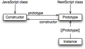 When you think of a class as a construct that produces instances, then the closest thing to a class that JavaScript has are constructor functions (Sect. 2). In contrast, NextScript uses plain old (non-function) objects: