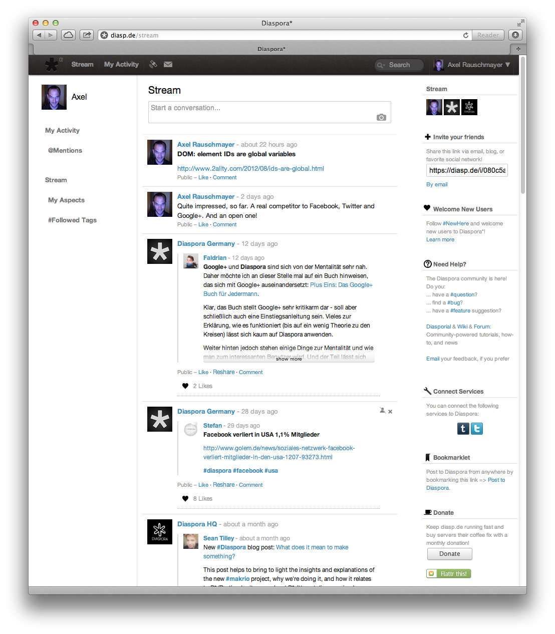 I like how it works, very intuitive, a bit like a slightly more ugly version of Google+ (which I’ve always found to be less confusing than Facebook). To make a backup or to move to another server, Diaspora lets you export your data (posts, contacts, etc.) and your photos.