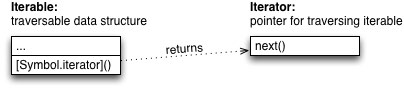 Source: A value is considered iterable if it has a method whose key is the symbol [1] Symbol.iterator that returns a so-called iterator. The iterator is an object that returns values via its method next(). We say: it enumerates items, one per method call.