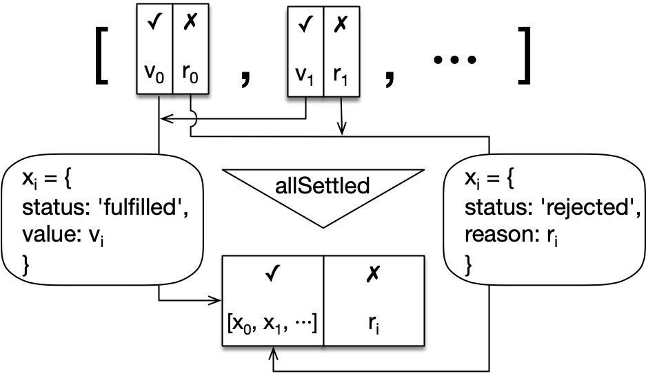 Promise.allSettled() The next example is similar to the .map() plus Promise.all() example (from which we are borrowing the function downloadText()): We are downloading multiple text files whose URLs are stored in an Array. However, this time, we don’t want to stop when there is an error, we want to keep going. Promise.allSettled() allows us to do that: